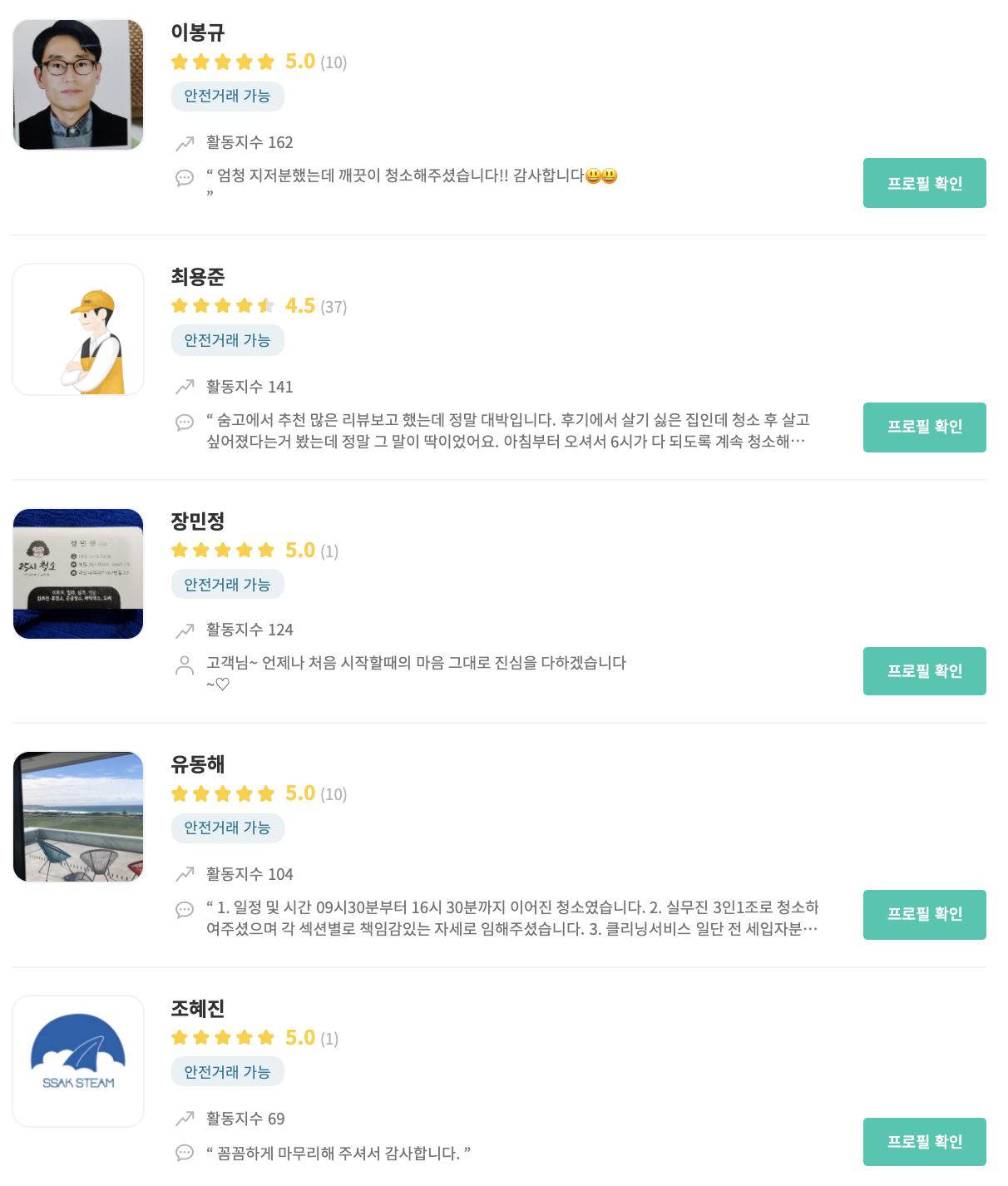 집 청소 전문가의 프로필, 비용 비교하고 결정할 수 있어요.