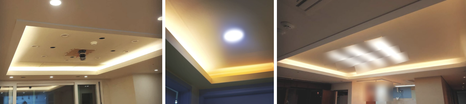 원형 간접등은 보통 가정집에 많이 설치하는 조명입니다. 아파트 거실 아트월 쪽, TV와 쇼파를 놓는 곳에서 자주 찾아 볼 수 있습니다. 큰 집의 경우, 복도가 많기 때문에 복도를 비추기 위한 용도로 복도라인에 설치합니다. 원형 간접등은 석고나 천장작업 되어있는 곳에만 설치가 가능합니다. 그리고 공간이 중간이 떠있어야 됩니다. 딱 붙어있으면 원형 간접등 자체가 깔끔하게 들어가지 않습니다. 원형 간접등 설치가 불가능한 환경은 콘크리트 벽과 콘크리트 천장입니다. 원형 간접등의 장점은 전기 효율이 좋다는 점입니다. 단점은 요새 원형 간접등이 일채영으로 나오기 때문에 전구만 가는 방식이 아니라 등을 통채로 교체해야됩니다.